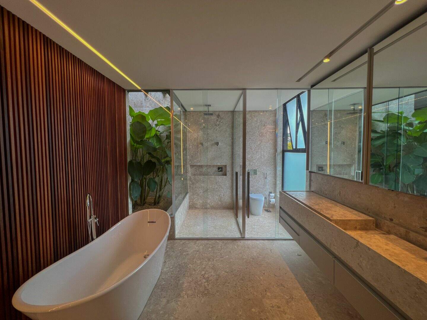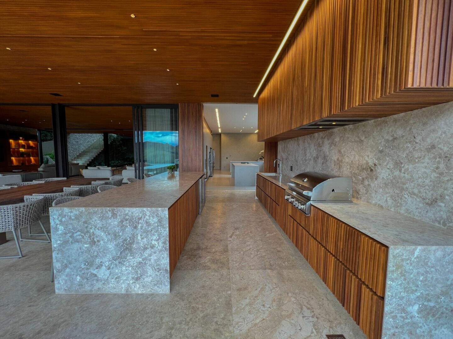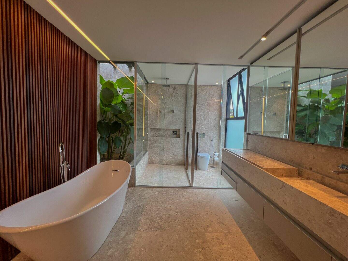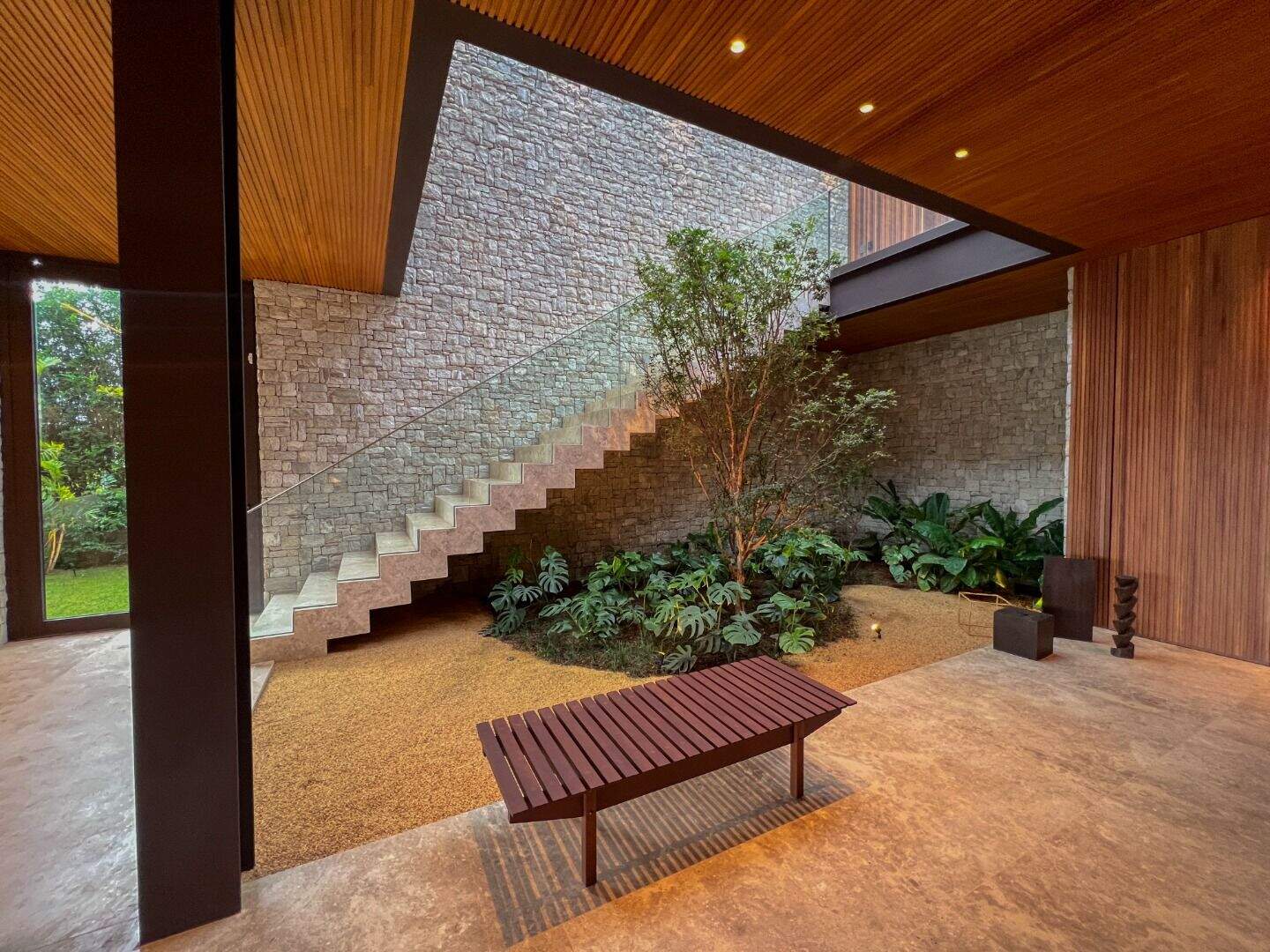 Casa no Vale dos Cristais a venda Projeto espetacular da Julia Belisário, usando muito verde, muita madeira e pedras nobres.Casa no declive com os 3 pavimentos, começando do primeiro que fica no nível da rua:1o Andar: 5 vagas de garagem paralelas, entrada imponente com lâmina de água com acabamento em pedra hijau, estar íntimo, copa noturna, 4 suítes, sendo 2 com closets e todas com acesso a uma super varanda integrada. Suíte máster para 2 ambientes, super closet e 2 banheiros finamente decorados, sendo o banheiro da senhora com banheira de imersão.2o andar:Sala com 4 ambientes, um super jardim na sala, lavabo, depósito reversível para adega, área de serviço, suíte de funcionários, cozinha/copa com ilha, tudo muito bem conectado com a varanda gourmet, churrasqueira, 2 lavabos externos, sala de massagem, banheiro, sauna, fogo de chão, hidromassagem com apoio a gás e uma super piscina para uma vista incrível.3o andar:Sala de máquinas super completa e organizada, banheiro para funcionários, academia, tatame, brinquedoteca, suíte de hospedes, 2 home offices e um banheiro social.Parte externa com paisagismo implementado e uma área de pomar.Infraestrutura:Casa com usina fotovoltaica, poço artesiano, carregador para veículo elétrico, aquecimento solar, bomba de calor para piscina, tratamento de ozônio da água, apoio a gás para a hidromassagem. Automação de som e de luz.Acabamentos: Casa com piso em mármore bege Bahia, quartos com piso em madeira natural, armários e closets da marcatto, metais de marca deka.
