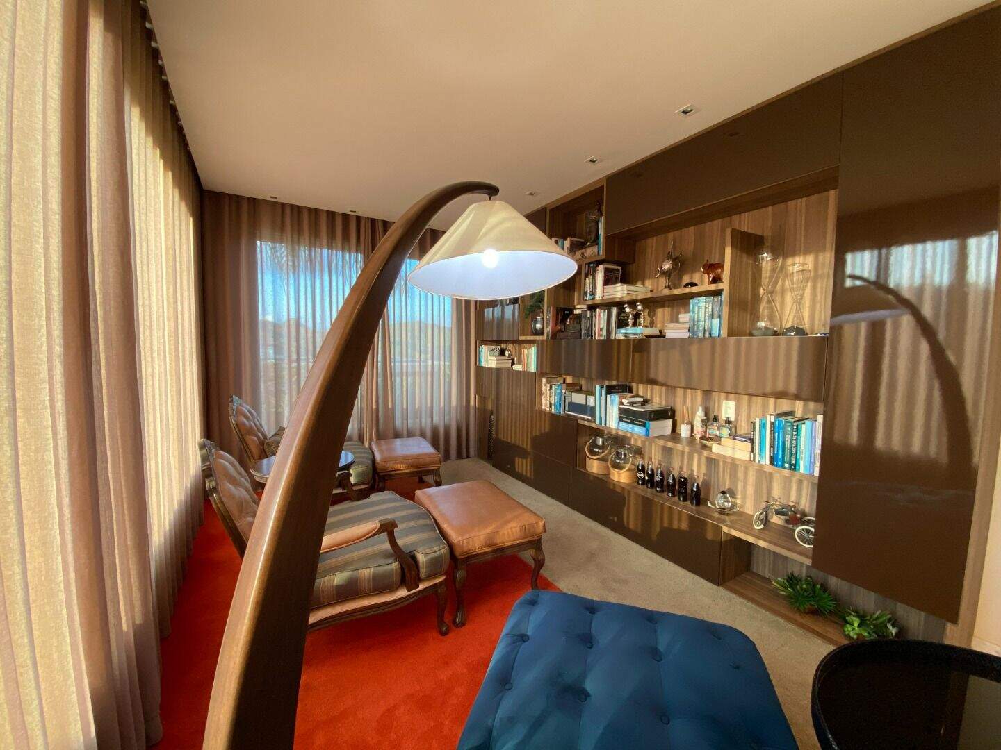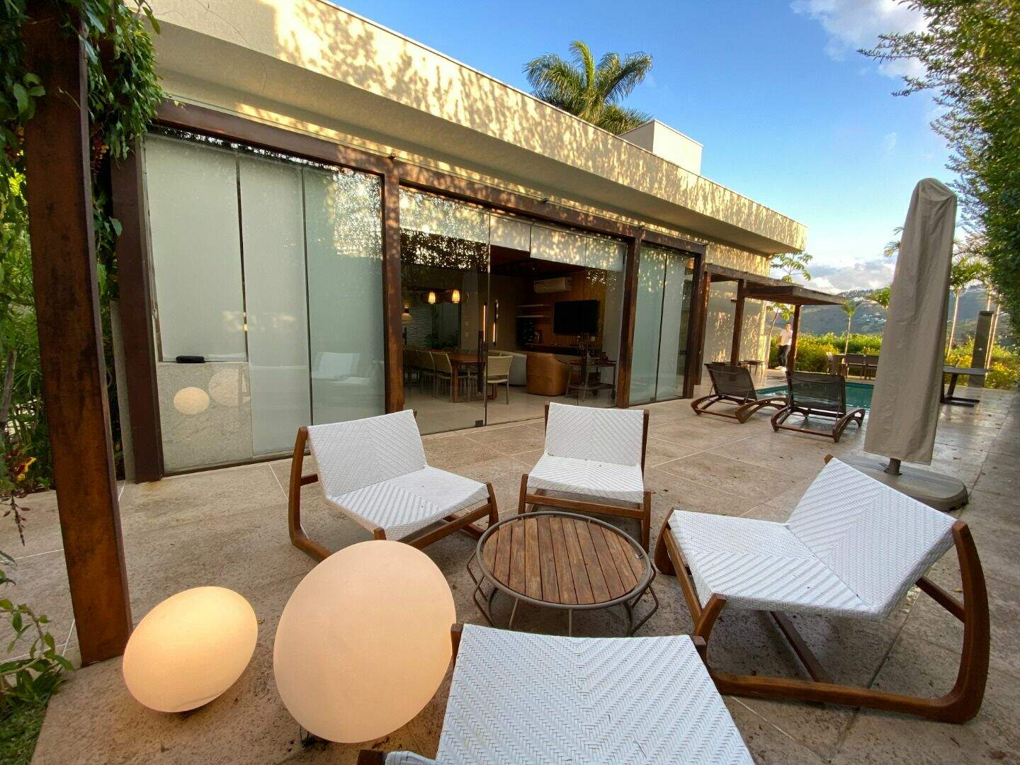 Imóvel Vendido pela Imóveis Alto LuxoCasa no Condomínio Nascentes no Vale dos CristaisPosicionada em um lote em aclive suave, no final de uma rua tranquila, próxima a uma rotatória.Casa com 2 pavimentos, dispostos da seguinte forma:Primeiro pavimento:3 salas conjugadas com piso em mármore Carrara, lavabo com pia esculpida em mármore italiano, biblioteca com marcenaria pronta e uma vista linda para o Vila da Serra. 3 vagas de garagem, cozinha com bancadas em granito, copa, despensa, louçaria, área de serviço ampla, banheiro de funcionários e dois quartos para funcionários. Parte externa com paisagismo do Luiz Carlos Orsini, lindíssimo, piso em preall, pergolados em aço cortem, piscina aquecida com cascata embutida no pergolado. 2 banheiros de apoio, área gourmet coberta com refrigeradores sob medida, home theater, bancadas em granito, marcenaria de primeira qualidade, ilha em granito com fogão elétrico e um acabamento em vidro para entrada de luz natural.Segundo pavimento:Estar íntimo, varanda tipo solarium com uma vista surreal para o Vila da Serra, copa noturna espaçosa, rouparia, 5 suítes com closets, bem espaçosas, banheiros com fino acabamento em mármore, suíte júnior com hidromassagem e a suíte máster com hidromassagem dupla e uma bela sala de banho com duchas e cubas duplas.Casa com acabamento excelente, em mármore, granito e piso da área íntima laminado.Toda casa com aquecimento de água, inclusive da piscina, fundo para uma área de preservação e um paisagismo muito bem feito em toda a propriedade.